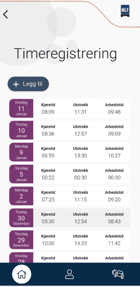 NLFs medlemmer har her et verktøy for registrering av arbeidstid,  oppfølging og kontroll av  kjøre- og hviletid og arbeidstid.
